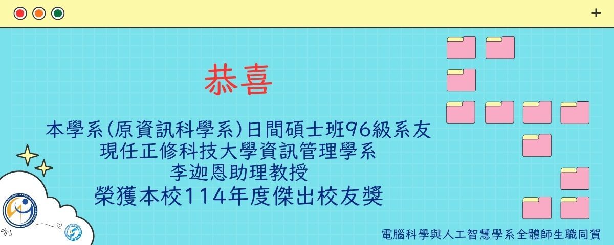 【恭賀】本學系(原資訊科學系)日間碩士班96級系友李迦恩助理教授榮獲本校114年度傑出校友獎