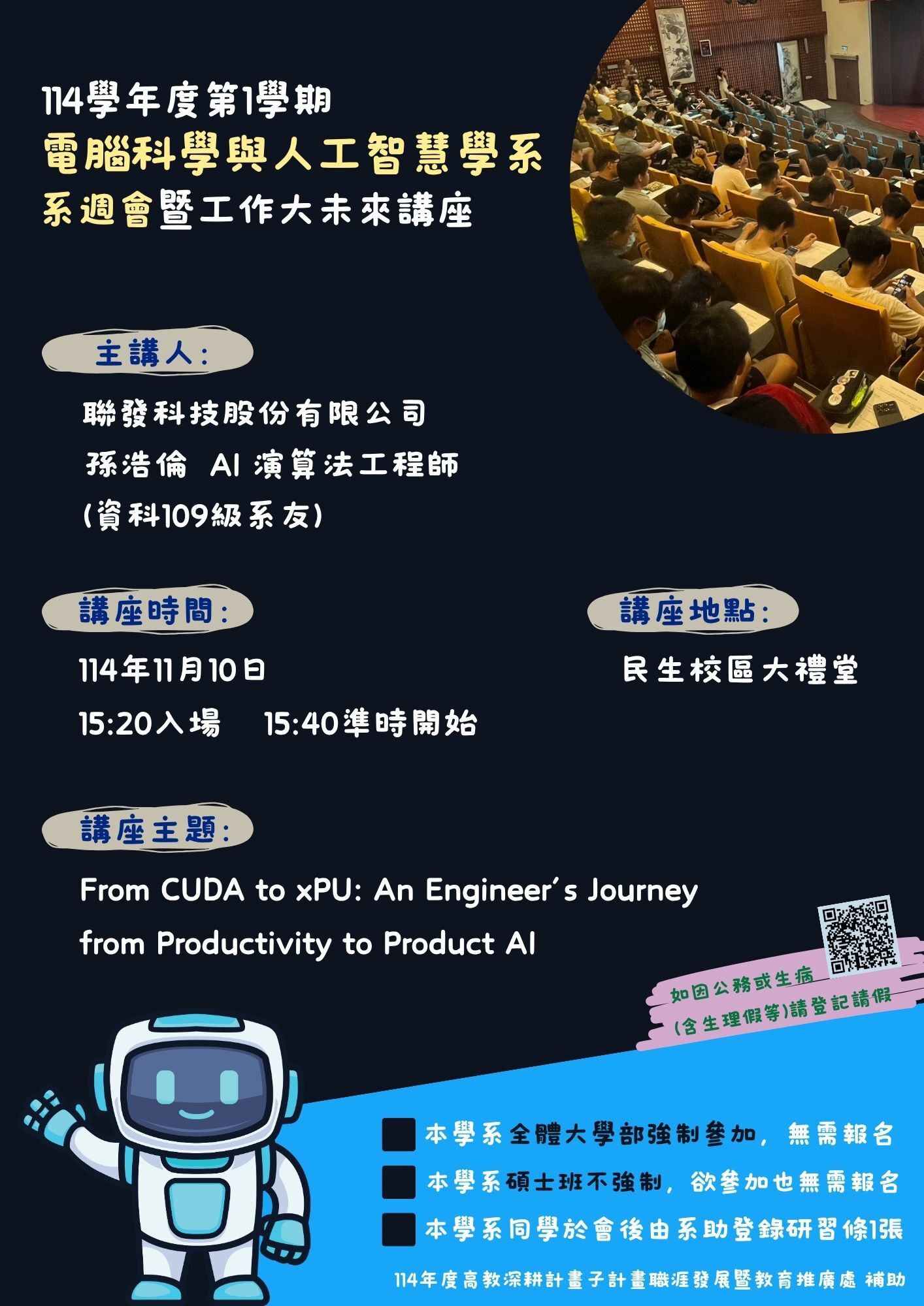 【活動】 電腦科學與人工智慧學系114學年度第1學期系週會暨工作大未來講座