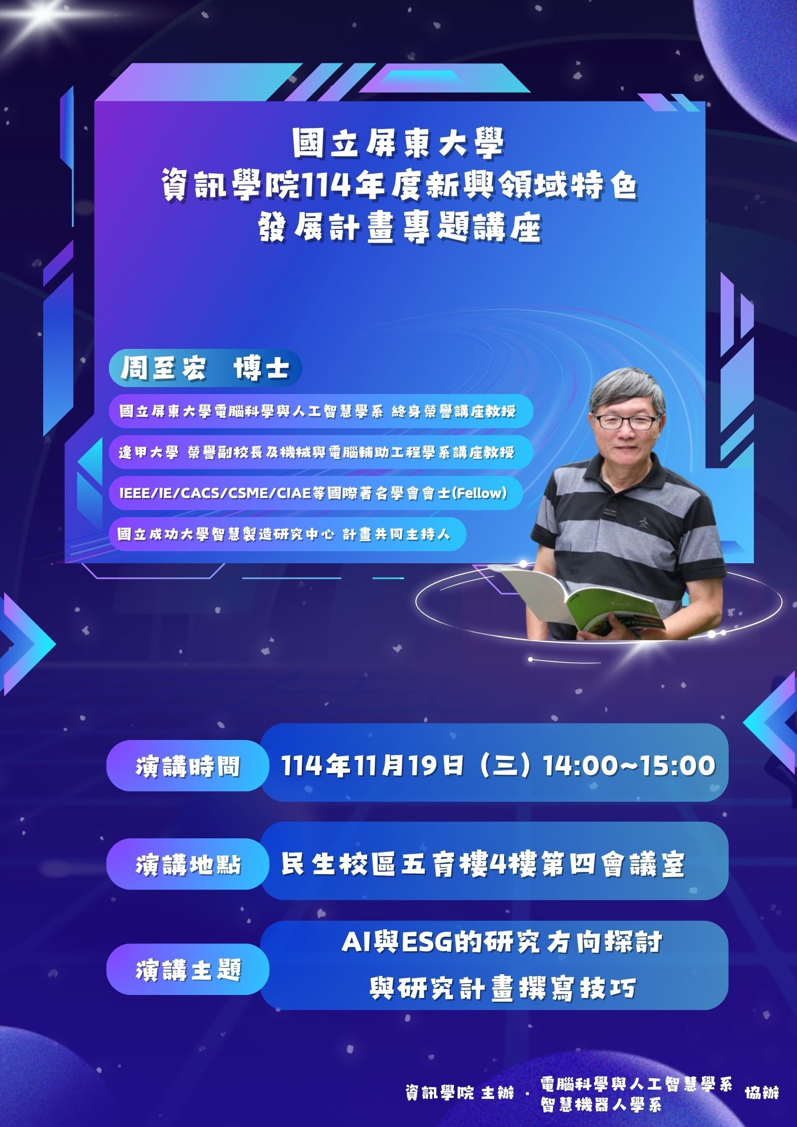 【公告】★限本校教師參加★ 114年度新興領域特色發展計畫「AI與ESG的研究方向探討與研究計畫撰寫技巧」專題演講